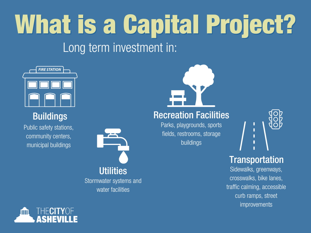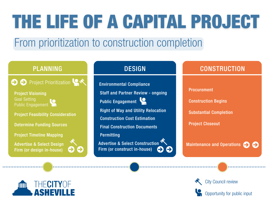 What is a Capital Project? Last updated or reviewed on September 23, 2025 A capital project is a significant investment that creates or improves a long-term asset. Capital projects traditionally take the form of large-scale physical developments, such as buildings, streets and other infrastructure. However, a wide range of other projects also qualify for capital funding, such as purchasing firefighting apparatus and other large vehicles, computers and technology, and other equipment. Methods of Funding for Capital Projects Capital projects are funded with a mix of internal City resources and external resources listed below. General Fund, as part of the operating budget Pay as you Go Debt service Federal & State Funds Bonds Grants Partnerships Project Selection The City of Asheville has more demand for capital projects than it has funds to pay for them, which is why we must be intentional about how to prioritize potential project ideas generated internally and from public feedback. Community engagement continues to be critical for uplifting the community’s real needs to determine priority capital investments. The City identifies potential capital improvement projects using technical assessments of infrastructure condition and need, and public input received through planning efforts. The annual project identification and prioritization process typically begins early in the calendar year with each City department conducting an analysis to identify capital project needs for the next five years. This is known as the Capital Improvement Program (CIP), part of the City’s annually adopted budget, where funding is committed to specific capital projects in the form of a 5-year plan. Project requests are evaluated and prioritized based on the following criteria: enhancing core services such as public safety, recreation programming and economic development supporting strategic priorities, such as sustainability, affordable housing, and quality of life availability of outside funding sources potential return on investment extending assets’ useful life The City Manager presents final recommendations to City Council as part of the budget development process. Council then holds public meetings to deliberate and adopt a final budget. This is another opportunity for community members to be involved in the process. The dates and times for those meetings are variable each cycle; however, the City Council must adopt its Budget and CIP by June 30 before the beginning of the fiscal year. Is a City capital project coming to your neighborhood? Here’s what to expect. The City has announced a project is going to be built in your neighborhood. What happens next? Most projects that involve infrastructure or construction still have several steps to go between when the project is put on the books and when you’ll see shovels hit the ground. The Life of a Capital Project – from Prioritization to Completion Planning phase: Once a project has been prioritized, it is now in what we call the planning phase. In this phase city departments work together with the community to solidify needs and wants, and to identify concerns. What happens during the planning phase: Visioning Public engagement Consideration of project feasibility Determining of funding sources Project timeline mapping Once funding sources are solidified, the administering department either begins designing the project (if designing in house) or prepares to accept proposals on a design contract. This is when we can begin building a timeline for project completion. Design phase: Next is the design phase. Staff is working to design a project that achieves the original goal while reflecting the community’s views in balance with feasibility. This is the most technical phase and depending on the project includes complexities such as right-of-way acquisition, utility relocation and multiple levels of review. Construction phase: Once the construction contract is approved by City Council, construction can begin! The City will be in touch with neighbors on high impact projects to talk about what to expect during construction. Just like any construction project, we often experience delays during the construction phase due to weather, unexpected discoveries, or supply chain and labor shortages. Project complete – open for public use Frequently Asked Questions Why do capital projects sometimes get delayed? Infrastructure projects, whether they’re new sidewalks, stormwater lines, or repaving, are critical for economic stability and improving the quality of life. These projects are complex and bring forth an array of challenges that can cause significant delays. Changes to project timelines can be frustrating for both our project teams and for the community. We appreciate the community’s patience and collaboration as we continue to improve Asheville’s public infrastructure. Some of the challenges often faced in infrastructure projects include: Changes to scope or design Infrastructure projects require careful planning and design, including feasibility studies, engineering designs, and detailed project plans. Any changes in scope or design during the planning phase can cause delays as these changes need to be reviewed and approved. Complex funding mechanisms Large-scale infrastructure projects often rely on a mix of public and grant funding, and obtaining this financing can be a slow process. Budget constraints, changes in government priorities, or fluctuations in the economy can further complicate funding. Supply chain and labor shortages Infrastructure projects depend on a steady supply of materials and skilled labor. Any disruption in the supply chain, whether due to global events like pandemics or local issues, can delay construction. Similarly, shortages of skilled labor can slow down project timelines. Weather and environmental factors Weather can play a significant role in delaying infrastructure projects. Construction activities are highly sensit