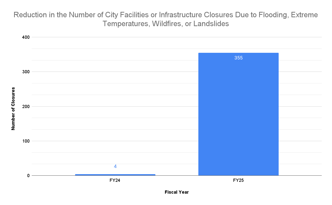 Fiscal year 2025 included impacts from Tropical Storm Helene and resulted in a significant increase in the number of closures of City infrastructure with a high probability of being weather related. Examples of closures include facilities, parks, roads, and services like electricity and water.