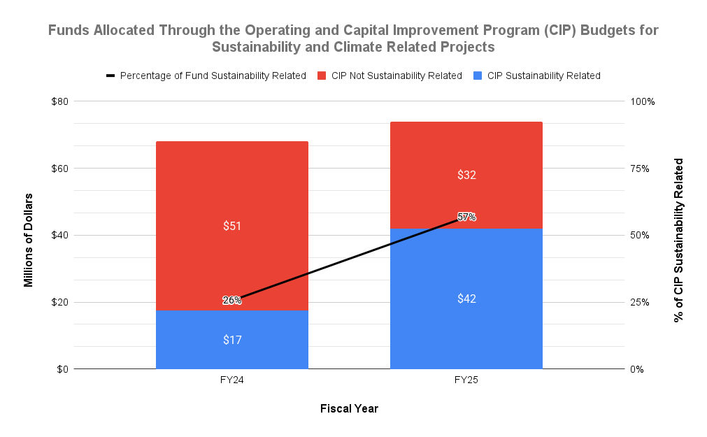 Funds Allocated through Capital Improvement Program Last updated or reviewed on October 7, 2025 $42 million of the fiscal year 2025 Capital Improvement Program (CIP) budget was used toward projects considered to be sustainability or climate-related. That accounts for 57% of the total $74 million dollar CIP budget. Some of the increased spending is due to Helene recovery projects that support enhanced resilience to future extreme weather. Desired Trend: Increase in funds allocated and percentage of total funds for sustainability and climate related projects. Methodology: Analysis of descriptions of Fiscal Year CIP projects to determine yes/no relevance to specific criteria including energy efficiency, fleet electrification, green infrastructure, renewable energy, resilience development, infrastructure hardening, and habitat development. Summed allocated project funds determined to be relevant in the fiscal year. Current data available is limited to Capital Improvement Program budget.