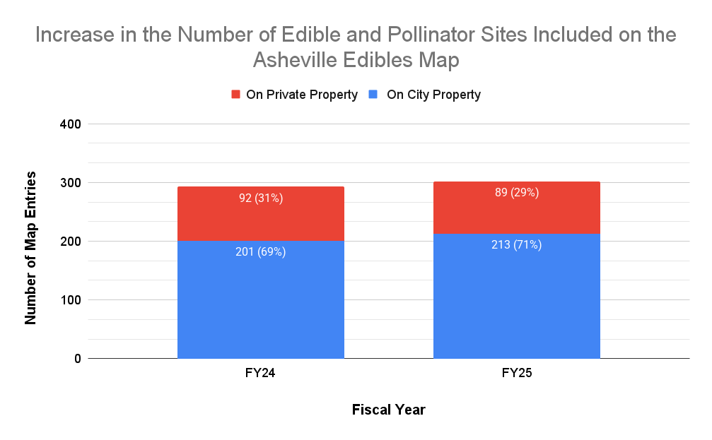Number of Edible and Pollinator Sites on Asheville Edibles Map Last updated or reviewed on October 7, 2025 There are over 300 edible and pollinator site entries in our Asheville Edibles Map and over 2/3s of those are on City-owned property. The total number of entries increased by 9 from the close of fiscal year 2024 to the close of fiscal year 2025. That number accounts for the documented edible plants lost to Helene related flooding. Desired Trend: Increase in total number of entries for edibles on City property. Methodology: Analysis of edible sites uploaded to Asheville Edibles Map.