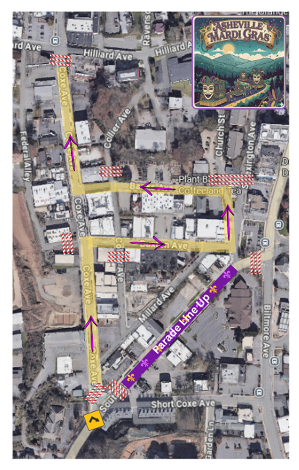 Mardi Gras fun returns to downtown Asheville Sunday, February 15, 2026. There will be route and traffic impacts as our community comes together to Let the Good Times Roll!