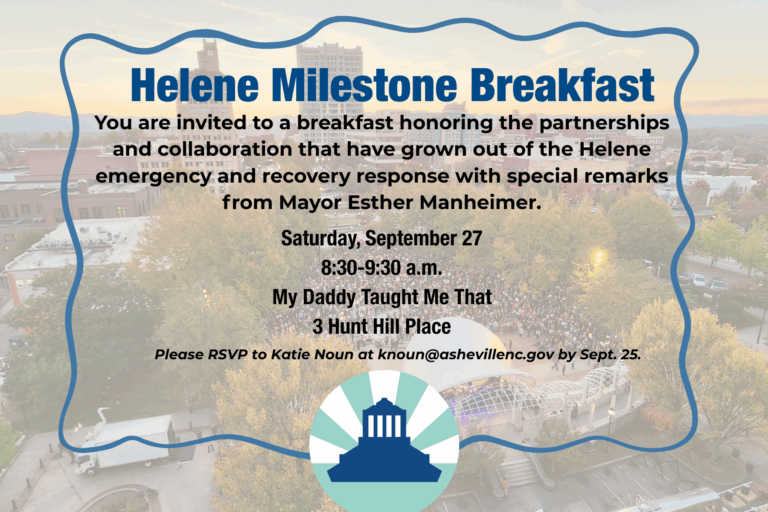 The City of Asheville invites the community to a Helene Milestone Breakfast honoring the partnerships and collaboration that have grown out of the Helene emergency and recovery response with special remarks from Mayor Esther Manheimer.