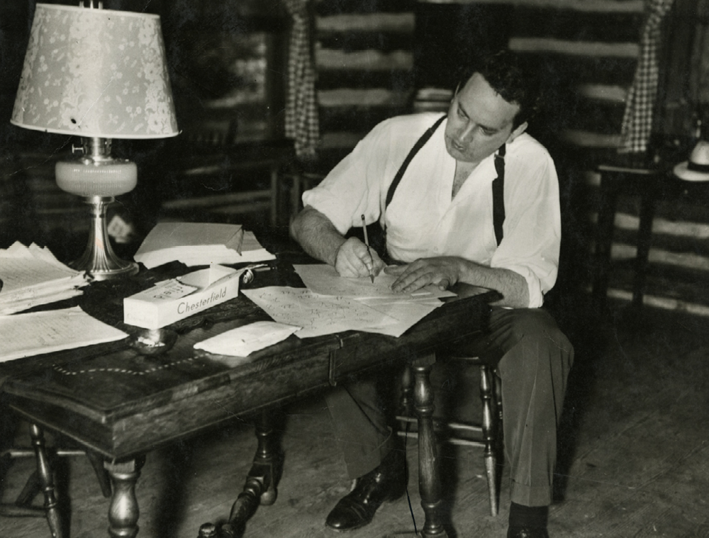 - Thomas Wolfe at work in Whitson’s cabin in the summer of 1937, sitting at a table with plenty of blank paper and an open carton of Chesterfield cigarettes. Print donated by Ewart Ball. Courtesy of Buncombe County Special Collections, Pack Memorial Public Library, Asheville, North Carolina.