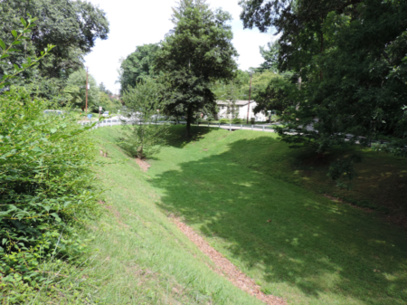 In total, five vacant residential lots and five single-family residences were purchased or acquired through condemnation for the new park. A hill was removed in Walton Street Park to further develop recreation features at that location with the dirt moved to Kenilworth Park to level its steep grade. In the process, Wyoming Road was widened and a culvert added to realign a creek that flowed through the area of the park earmarked for a ballfield.