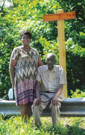 - George Gibson Sr. and daughter Olivia Gibson Metz pose with a sign installed at the corner of Norfolk Street and Wyoming Road.