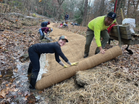 - Through the City of Asheville’s Neighborhood Matching Grant program, Kenilworth Residents’ Association are repairing the riparian buffer of Gibson Creek by planting native woody plants and restoring 200 ft of heavily eroded creek bank in Meadow Park in collaboration with RiverLink. Courtesy of Kenilworth Residents’ Association.