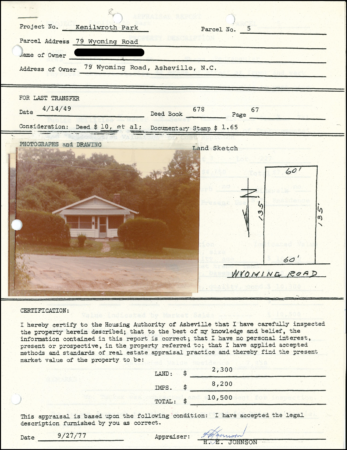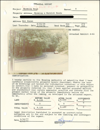 within the designated community development area and one of them mentioned the former Abograst Estate. While engineers deemed the site less than ideal, no other suitable locations emerged and the City of Asheville contracted with the Housing Authority of the City of Asheville (HACA) for property acquisitions and relocation services for affected residents.