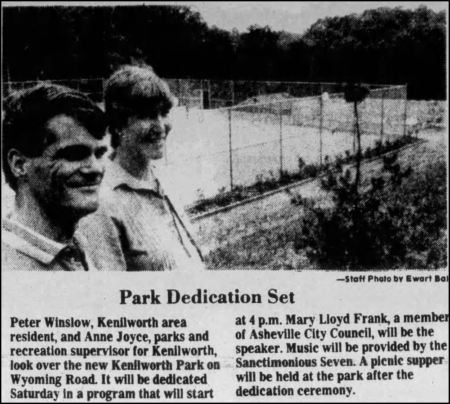 Kenilworth Park was dedicated on July 24, 1982 during a public ceremony followed by a softball game, parachute and frisbee demonstrations, community picnic, and entertainment by the Sanctimonious Seven. It contained tennis and basketball courts, ballfield, playground, and picnic and restroom facilities.