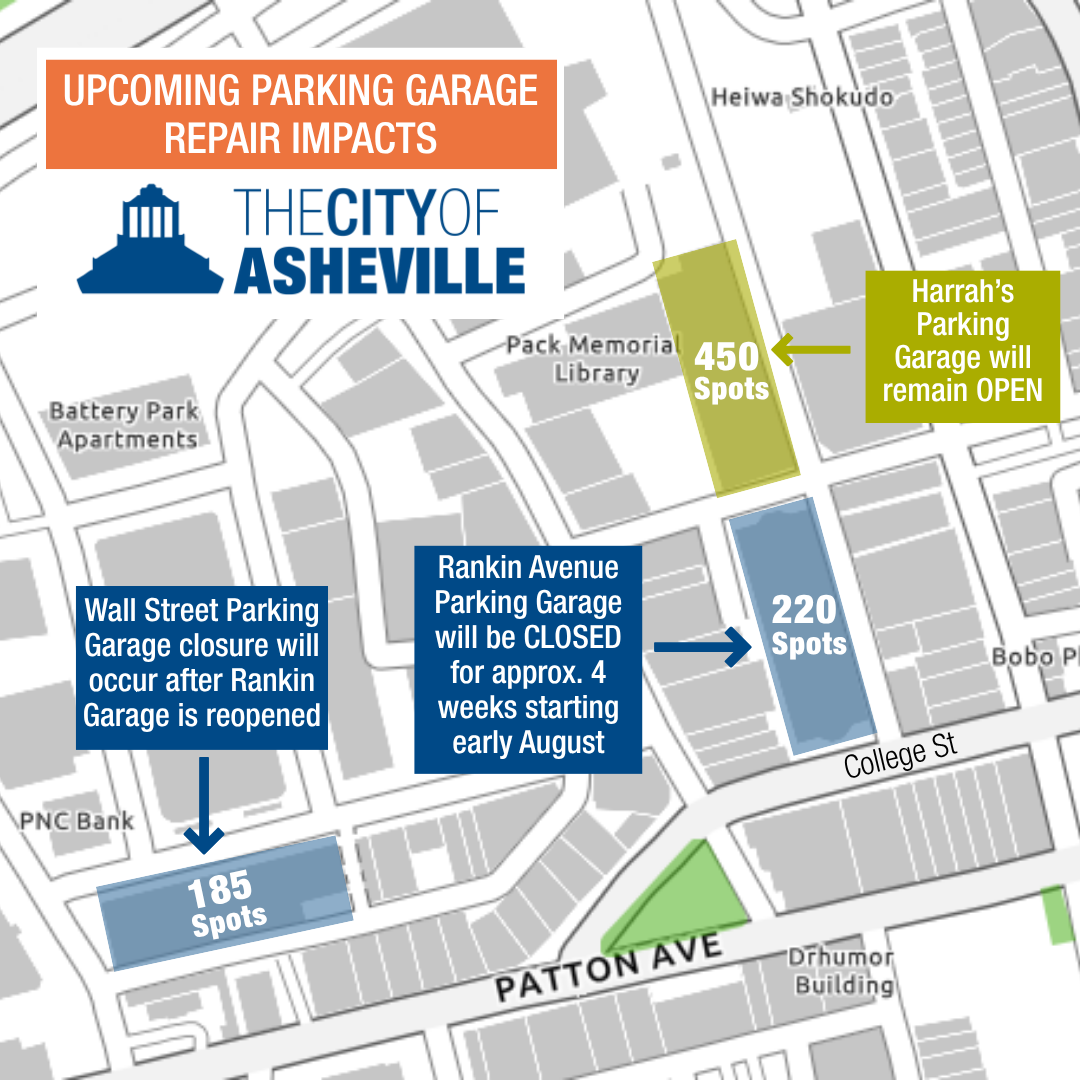 - Other City-owned garages: While the Rankin Avenue garage is closed, drivers may use any of Asheville’s three other City-owned parking garages: Biltmore Avenue, Harrah’s Cherokee Center garage, and the Wall Street garage. These typically offer the first hour free. Once the Wall Street garage closes for repairs, the Rankin Avenue garage will be available.