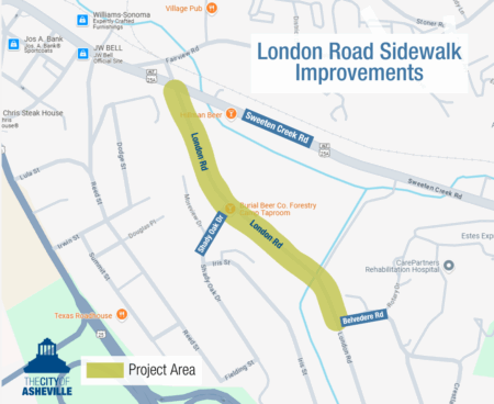 The City of Asheville is making improvements to the northern section of London Road (between Sweeten Creek Road and Belvedere Road) including the installation of continuous sidewalk and stormwater infrastructure upgrades. This project is funded by the voter-approved 2024 General Obligation Bond. For project updates, timeline, and background information, click the button below.