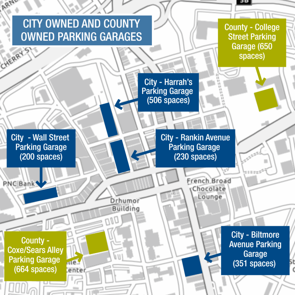 The City of Asheville operates four parking garages (click here for real-time space availability); each is open for public parking 24/7, and offers hourly, daily, and monthly parking.